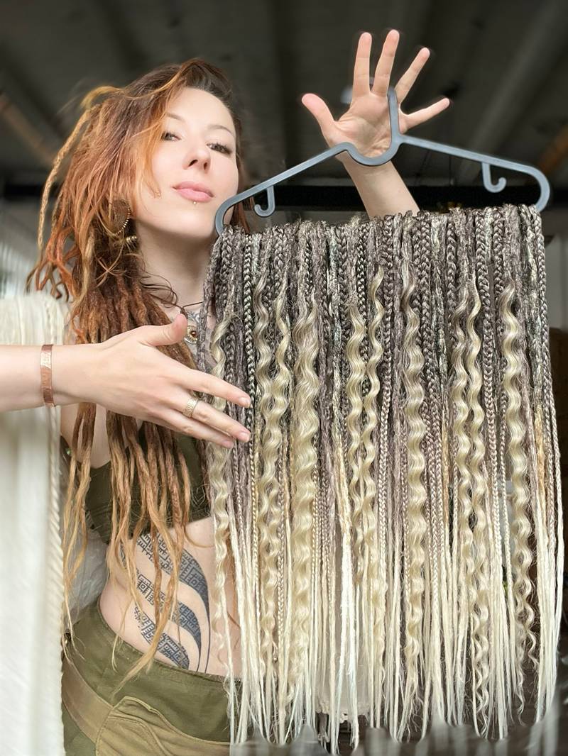 • materiał: włosy syntetyczne (zestaw może być miksem dredów, twistów, warkoczy, kłosów, loków lub w całości składać się z jednego rodzaju elementów)